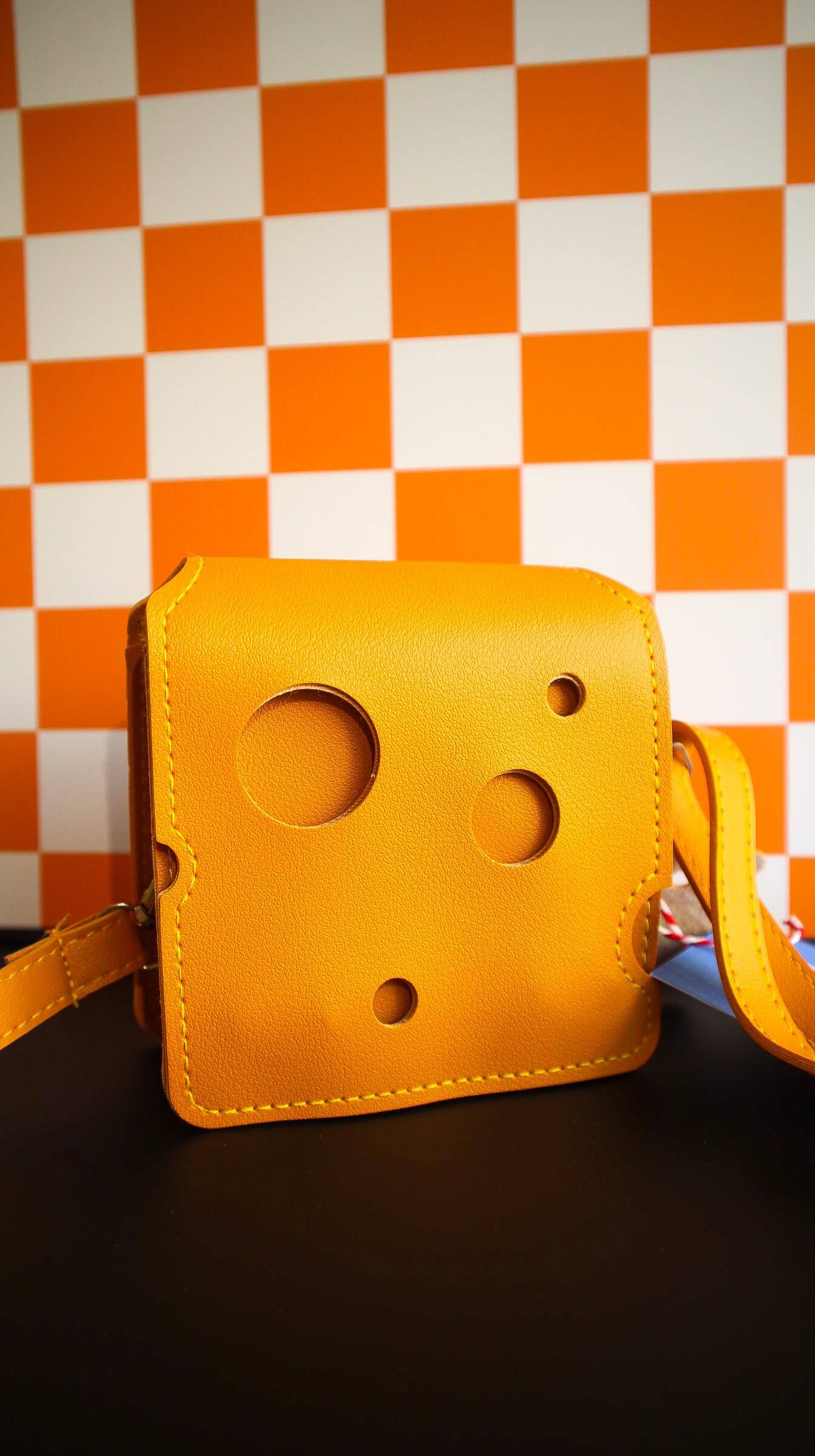 The structured design keeps its shape beautifully, with stitching details that enhance the cheese aesthetic. Inside, there’s enough room for your essentials.