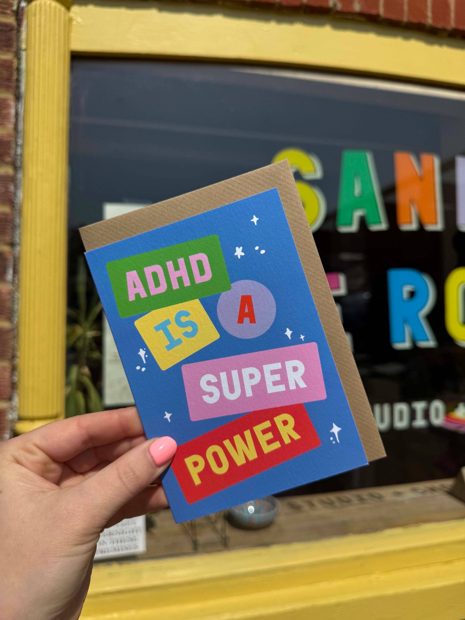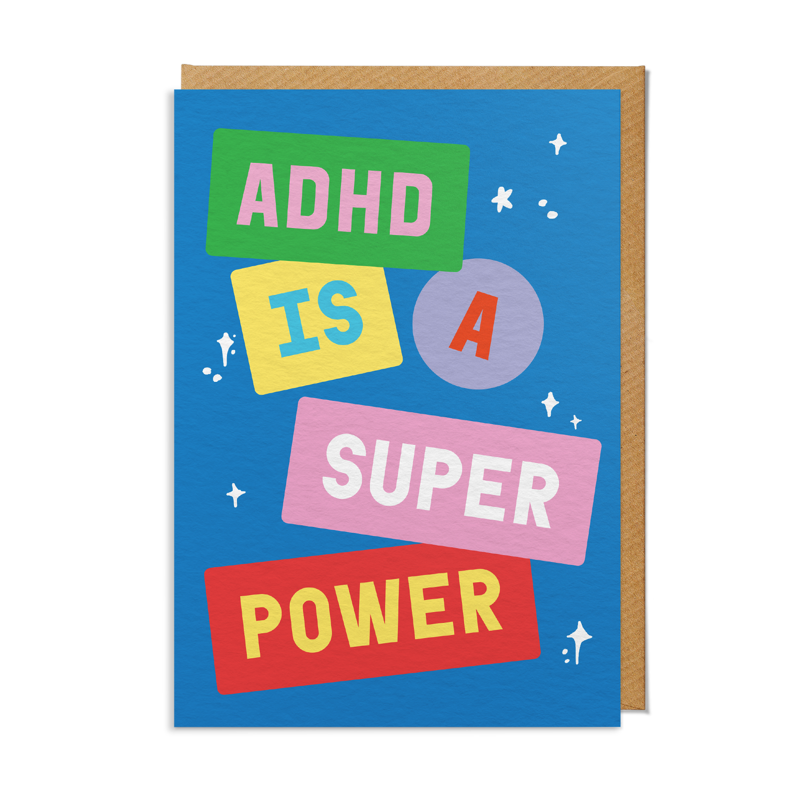 A bold typographic card celebrating the strengths and creativity that come with ADHD. Designed by Sanders de Roeper founders Hatty and Tim—both proudly diagnosed with ADHD—this card reflects their positive, empowered approach to life and work.