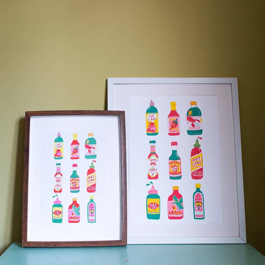 Inspired by a trip to Mexico, this fun design features 9 illustrated bottles with imaginary hot sauce labels. This print looks great in a kitchen and would be an ideal gift for a foodie, someone who loves to travel or for that person who just has to put hot sauce on everything!!