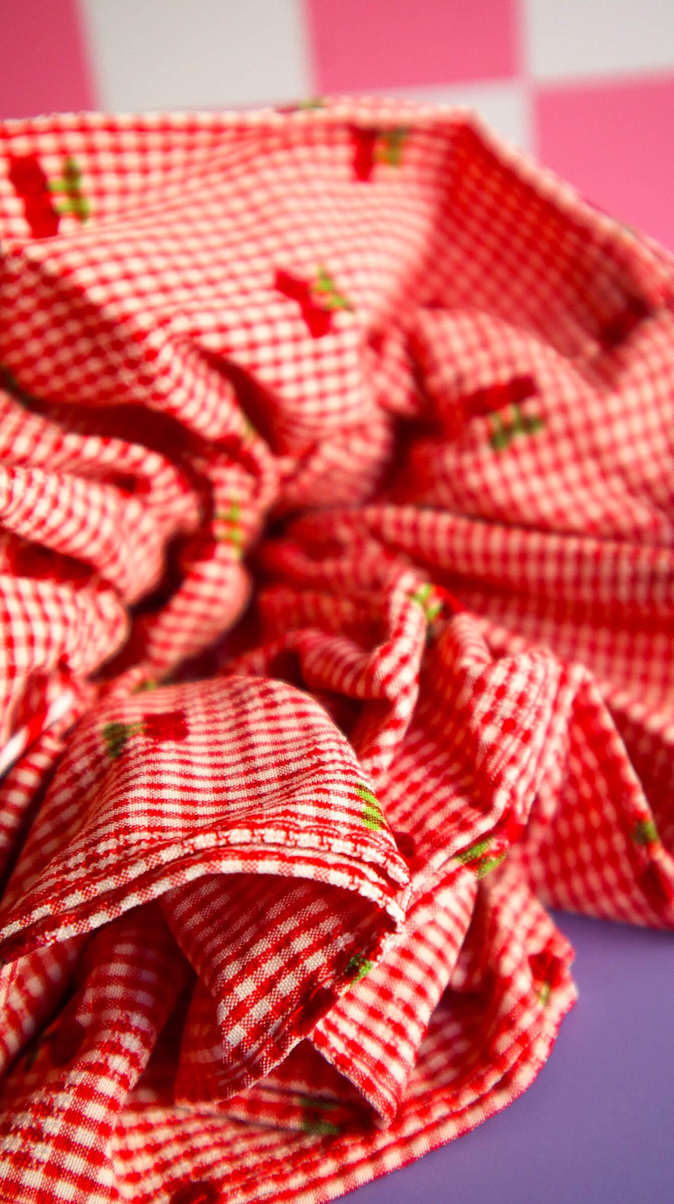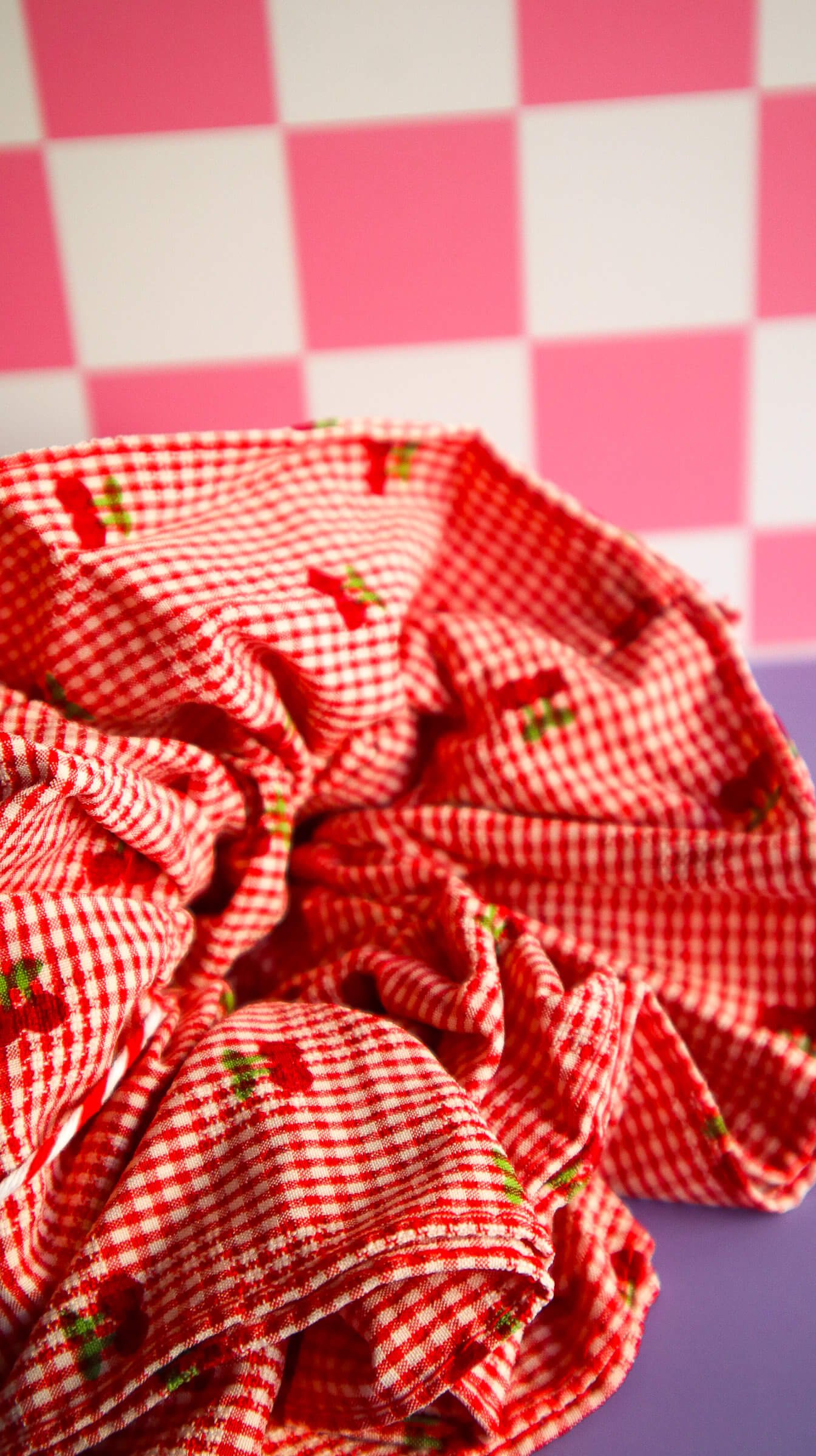 Your hair deserves this level of cute. This large cherry scrunchie features a classic red gingham check pattern with tiny embroidered cherries scattered throughout.