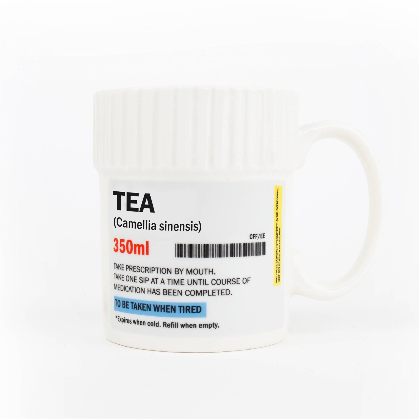 Ceramic mug styled like a prescription pill bottle